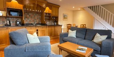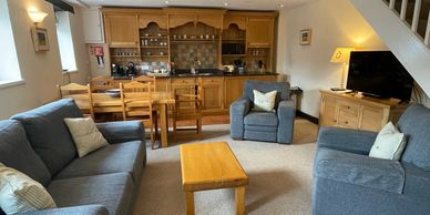 Formerly housing the water mill and water wheels this cottage has downstairs bedrooms, upstairs lounge and kitchen, and a delightlful gallery fourth bedroom and access to the upper courtyard.